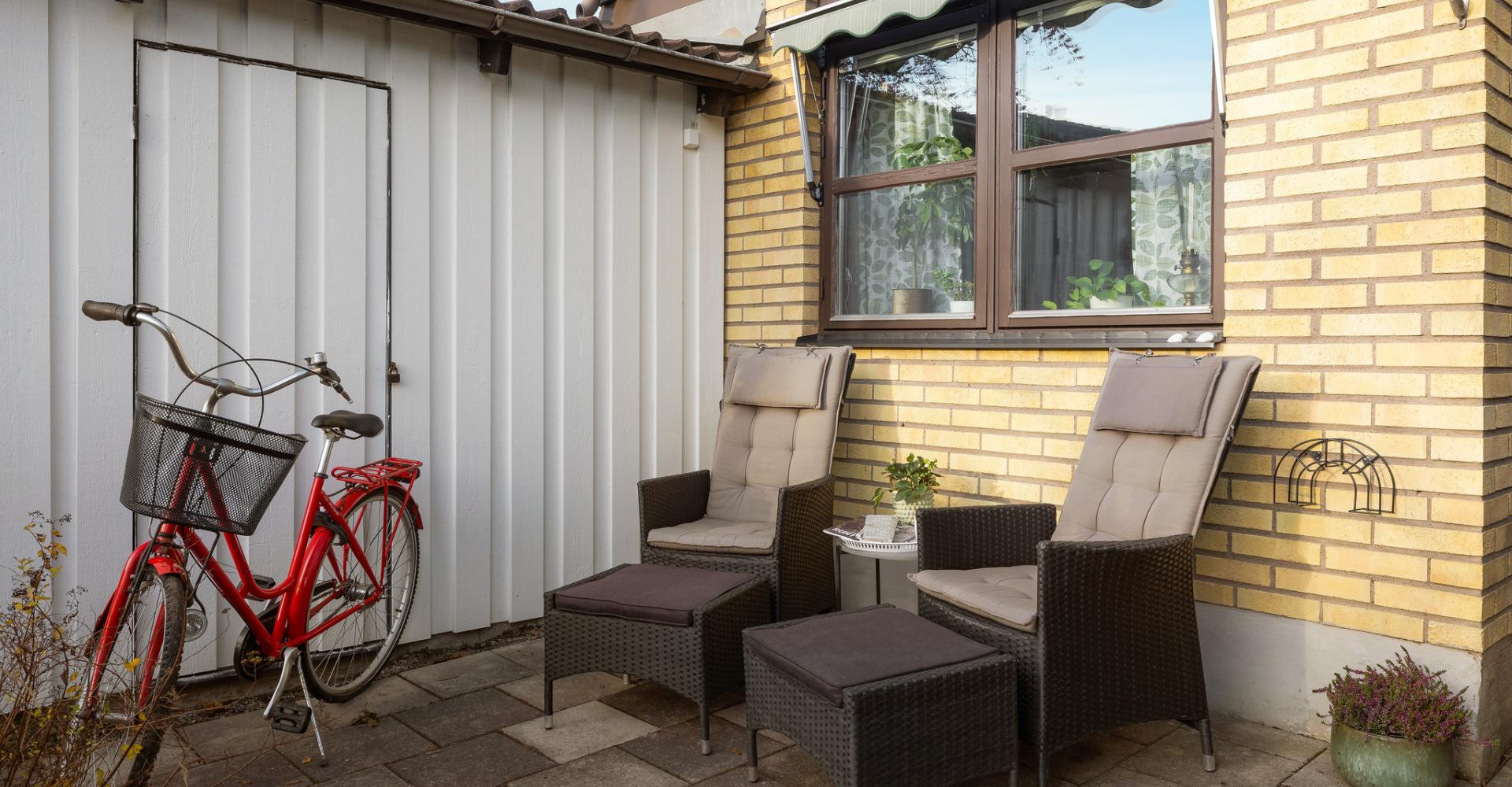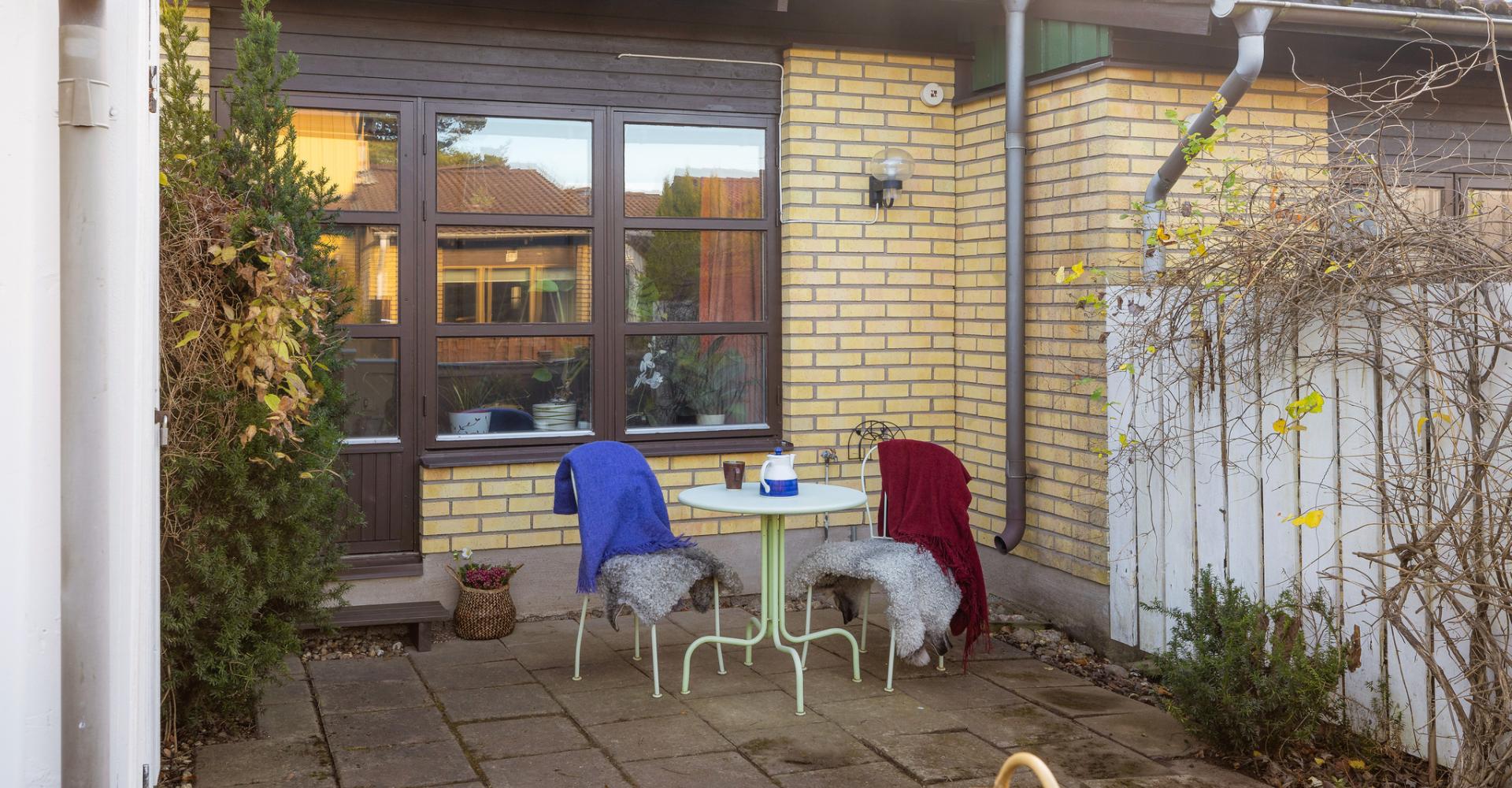 Stensatt uteplats på framsidan. Stensatt uteplats på baksidan.