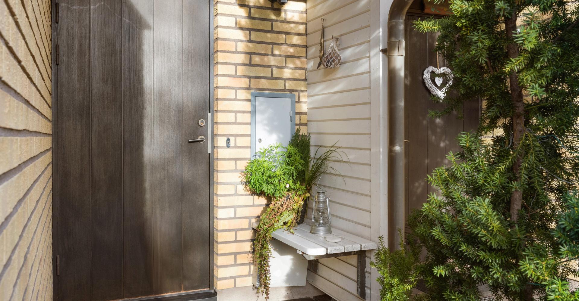 Förråd med el på framsidan av huset. Förråd på baksidan av huset.