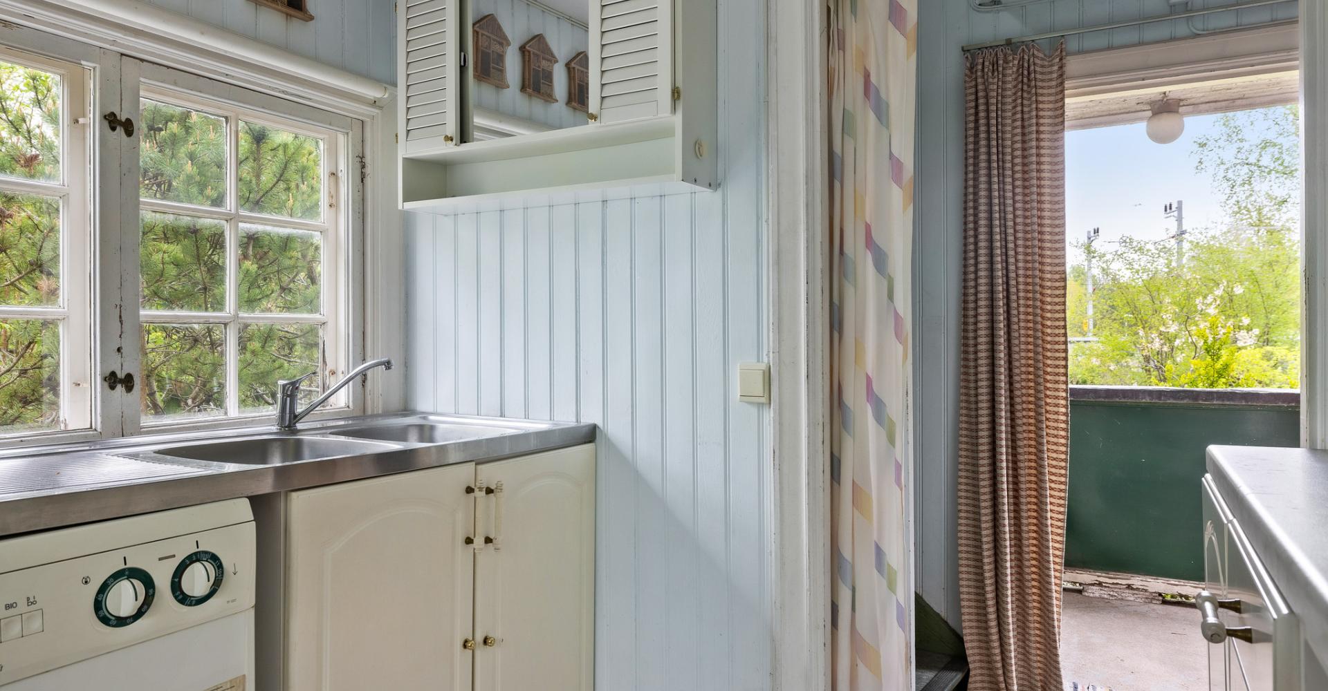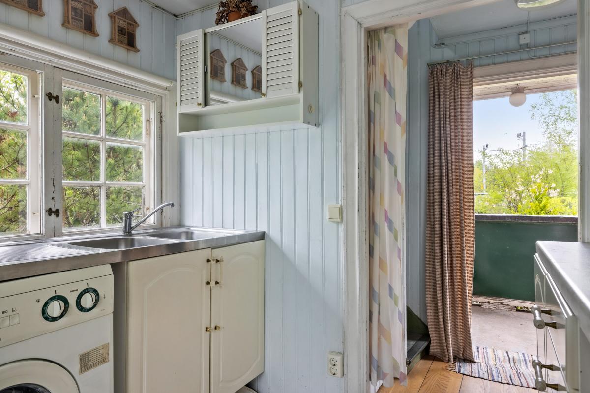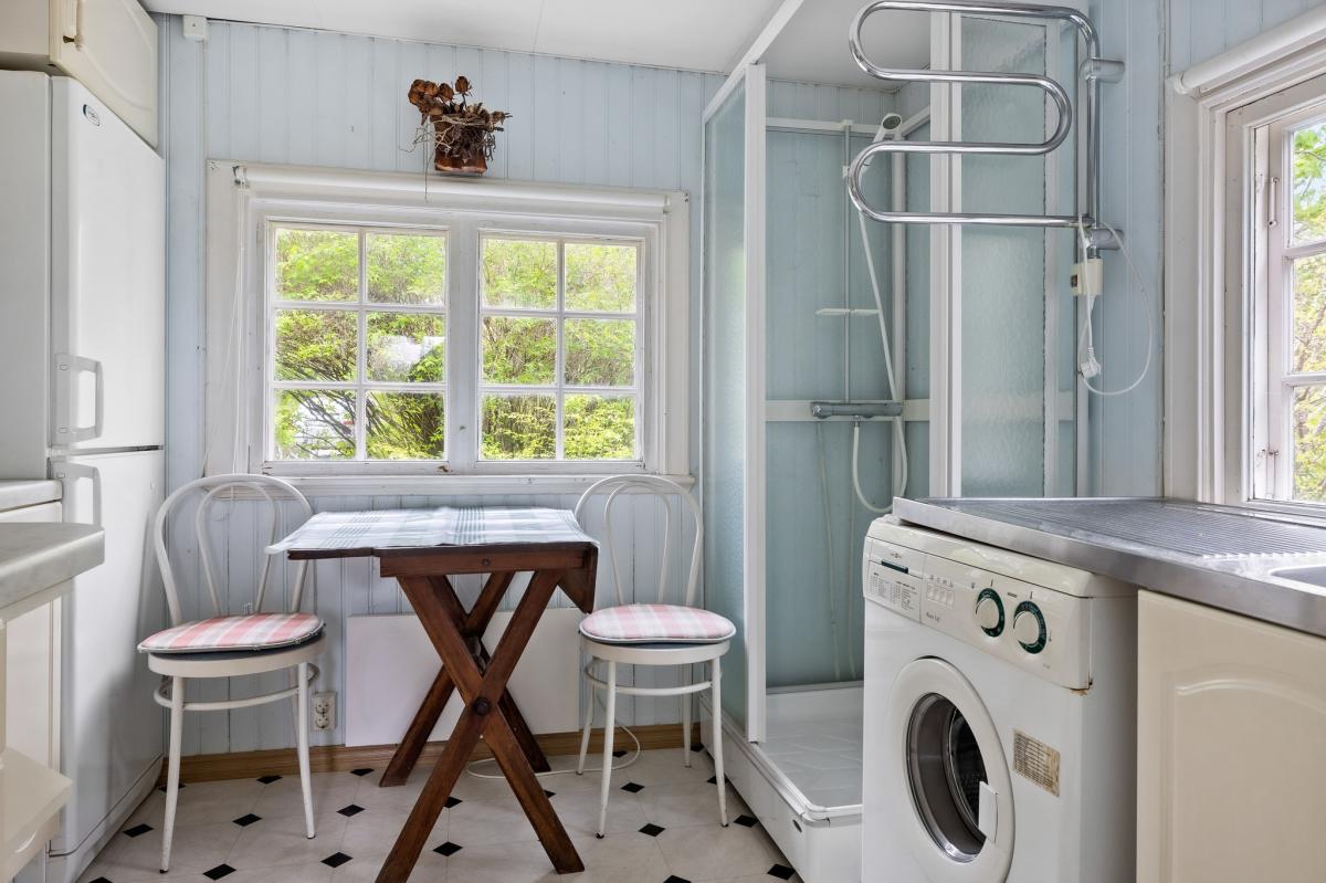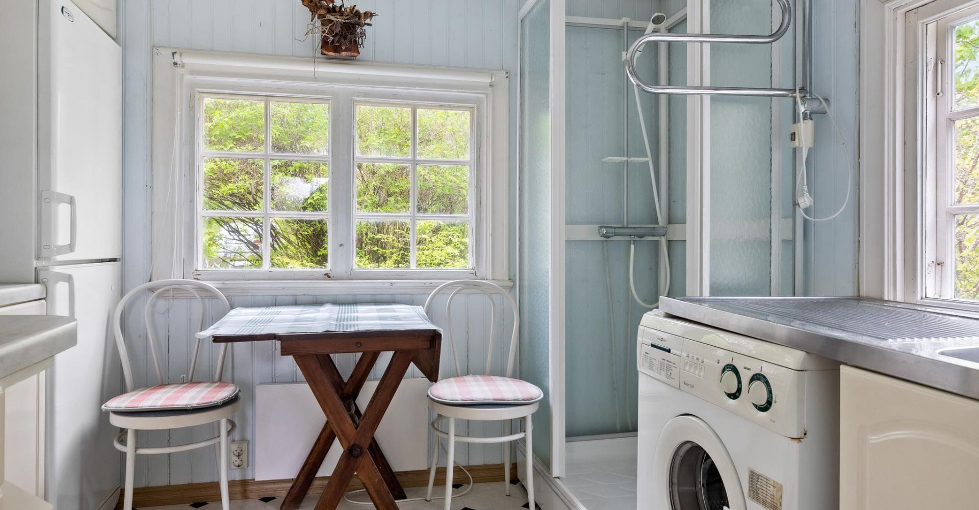 Kök med kyl/frys, duschkabin samt tvättmaskin