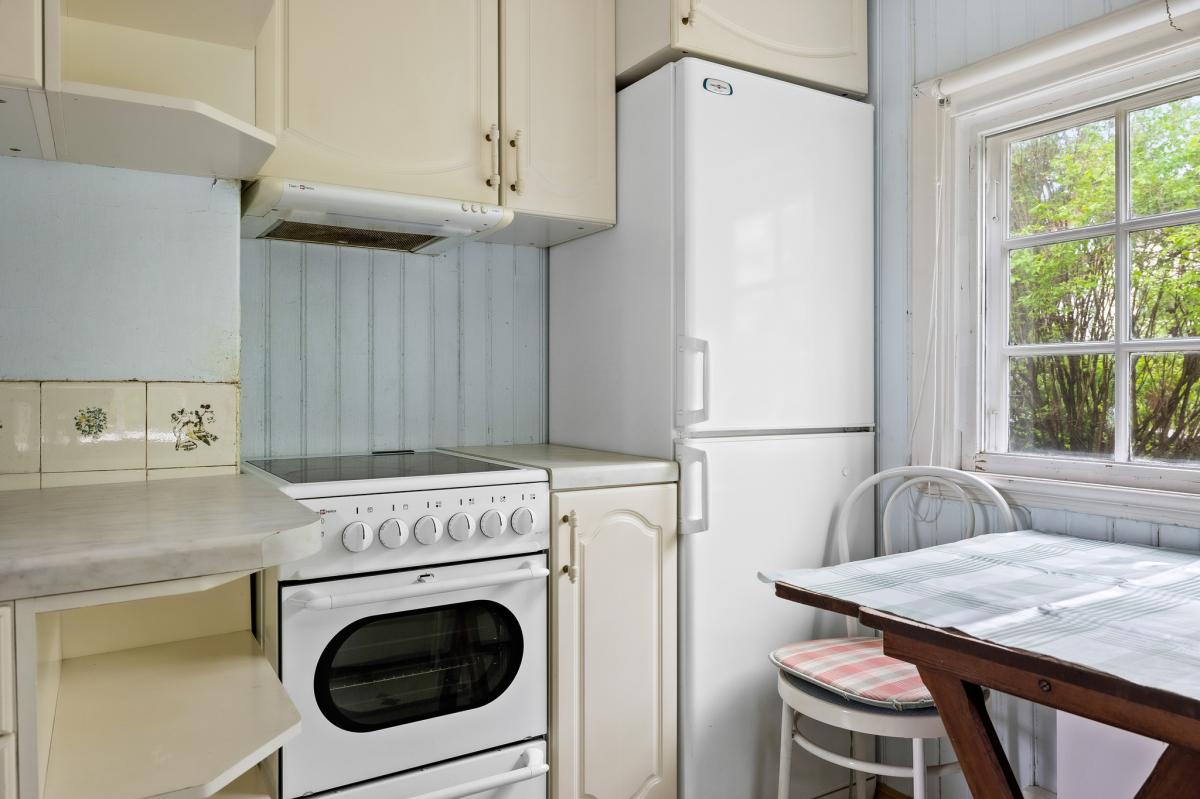 Kök med kombinerat duschrum med plastmatta. Utrustat med spis med häll, spisfläkt, ky/frys, tvättmaskin och duschkabin.