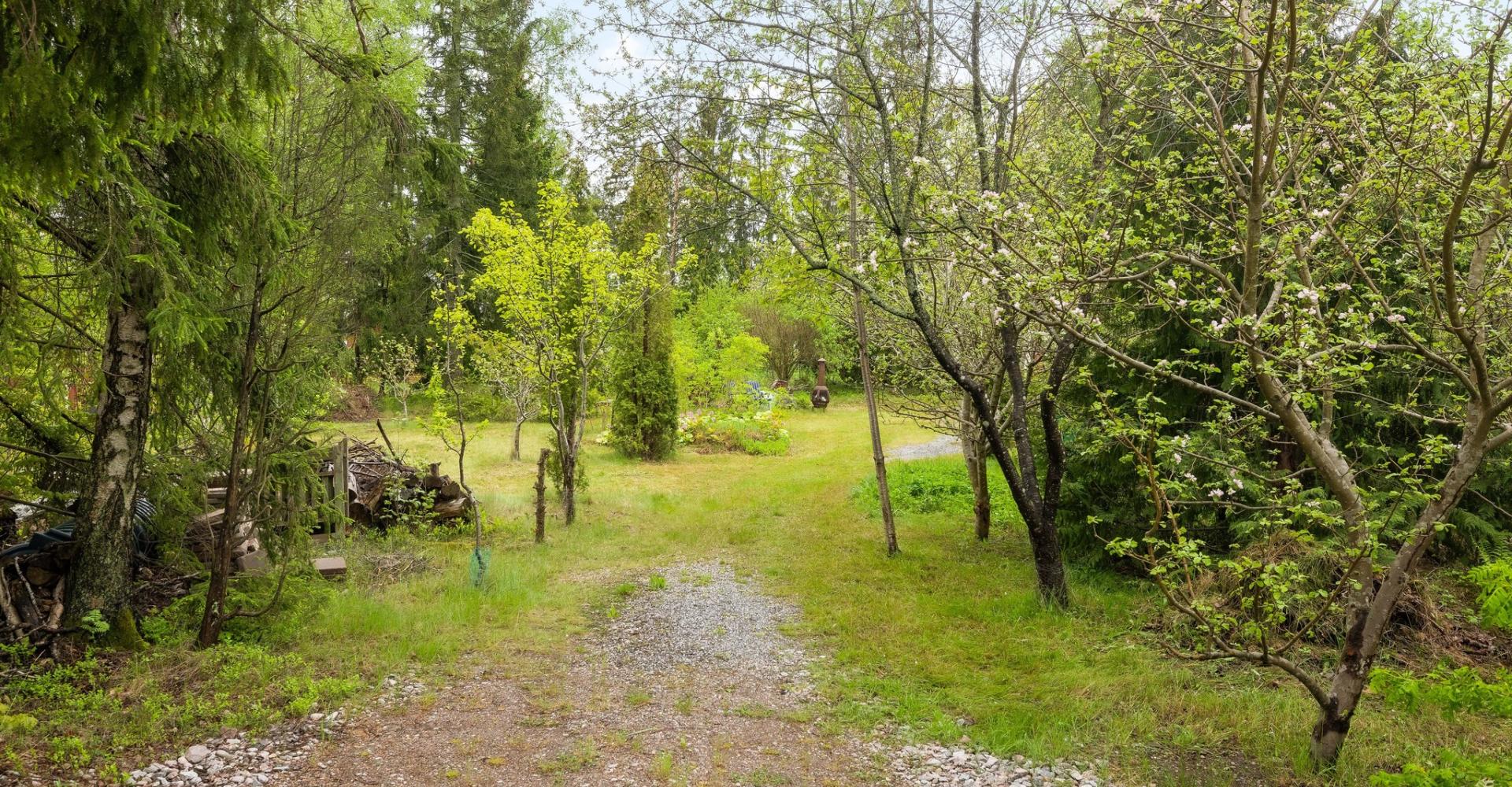 Plan trädgårdstomt med äppelträd, päronträd, körsbärsträd, plommonträd och hasselnötsträd . Det finns också fina buskar och planteringar.