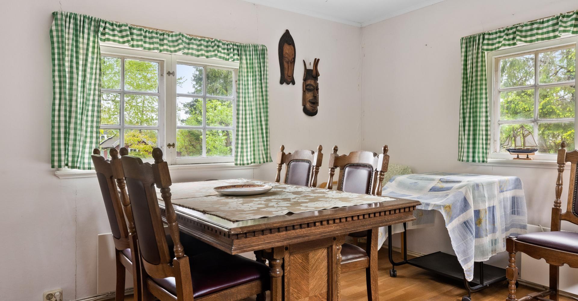 Vardagsrum med parkett, målade väggar, fönster åt tre håll.