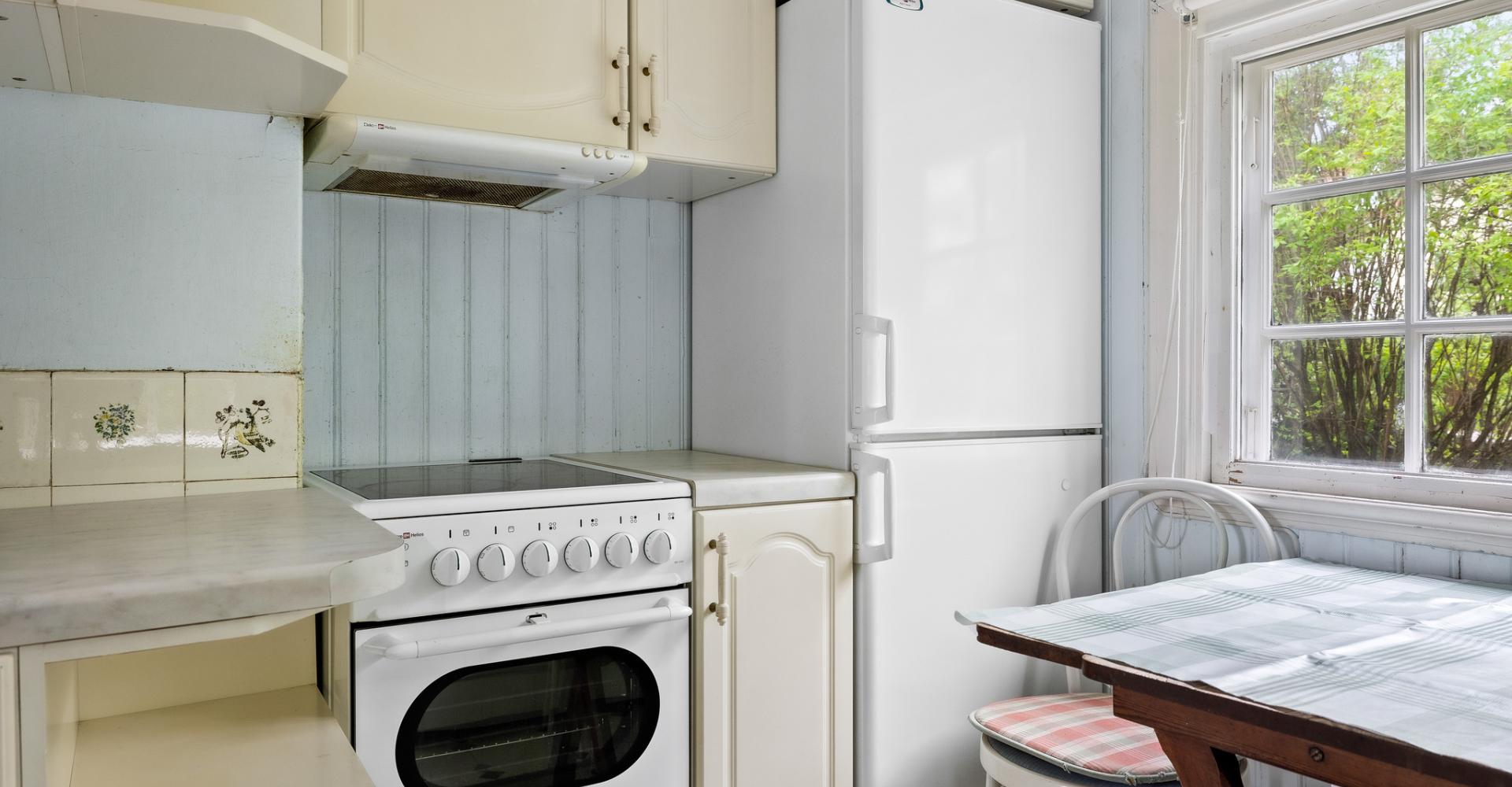 Kök med kyl/frys, spis med häll samt fläkt