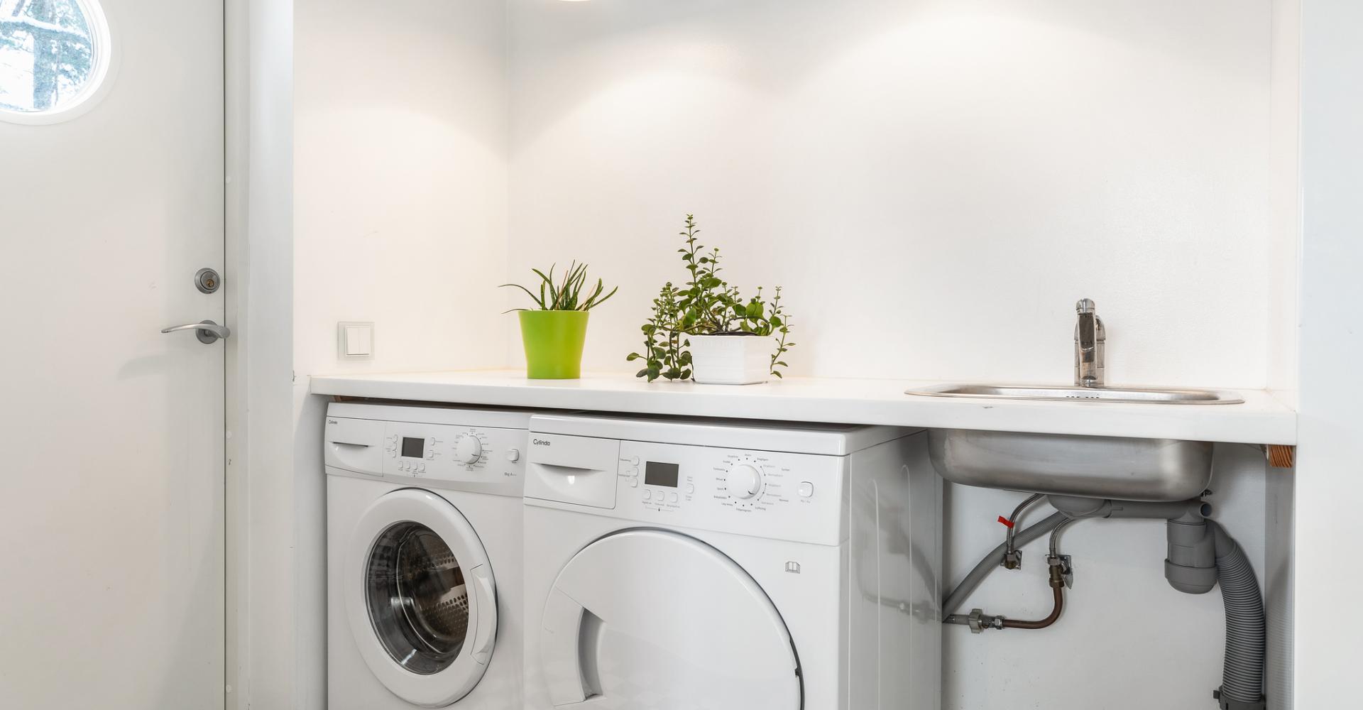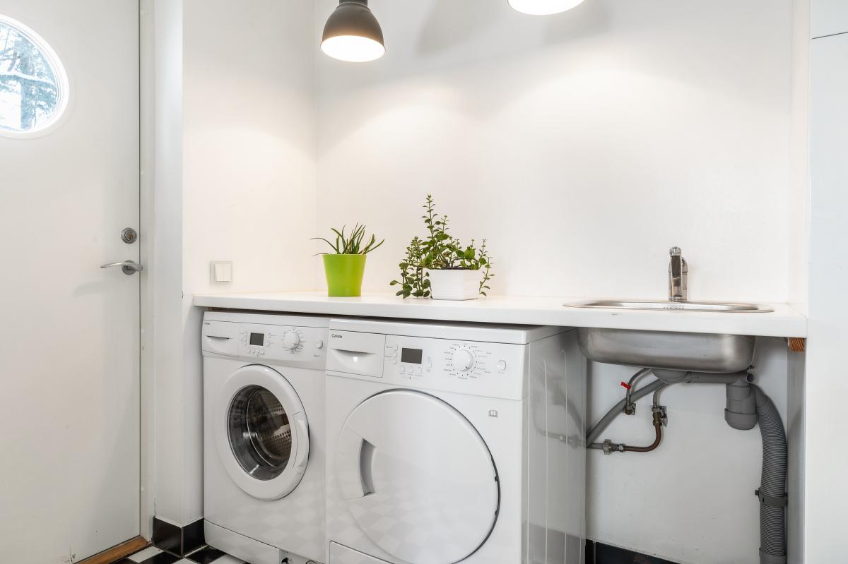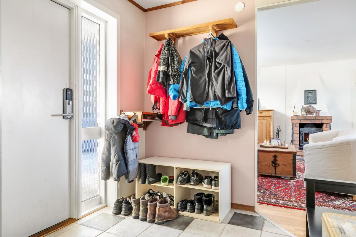 Dörr leder till garaget med plats för en bil, verkstad samt förvaring