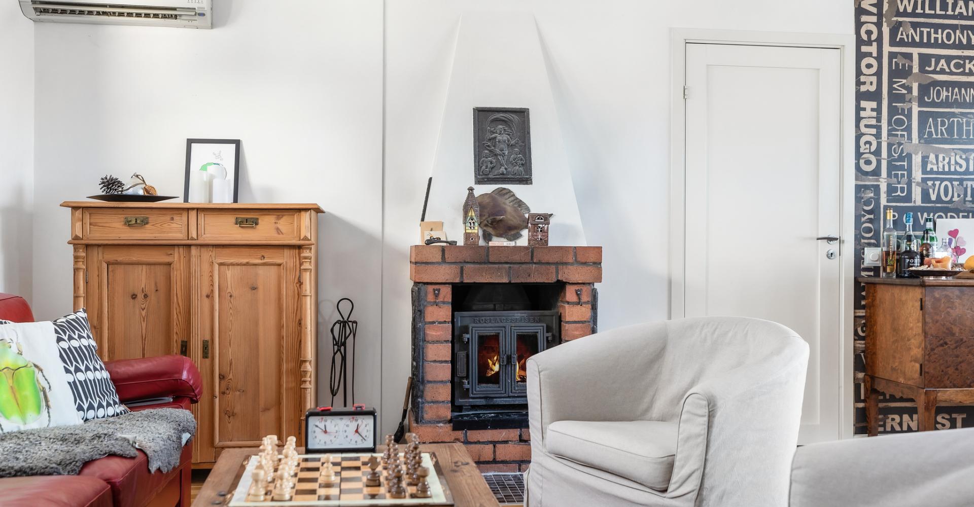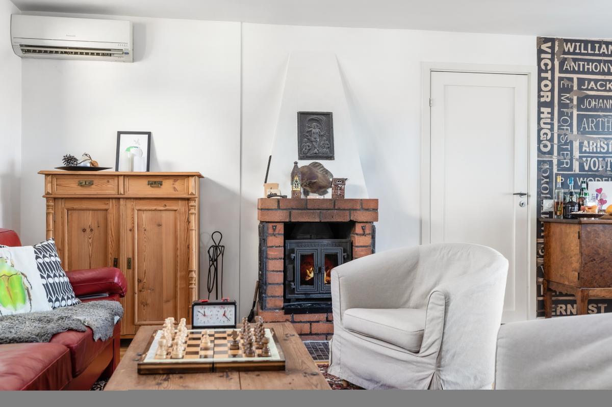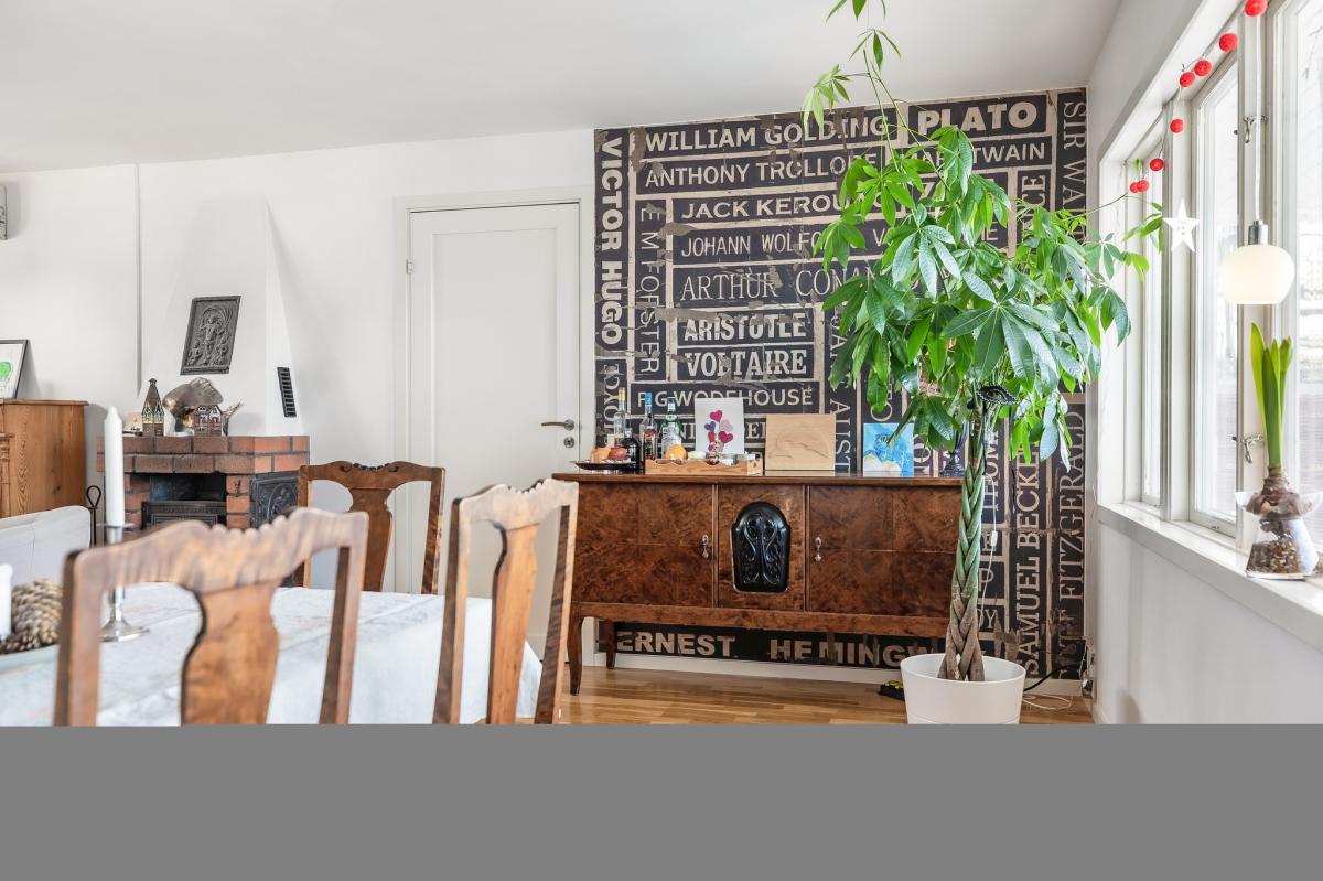 Vardagsrum i öppen miljö med köket i ett härligt ljust rum med stort fönsterparti åt väster ut över altan och den fria utsikten. Parkettgolv och braskamin.