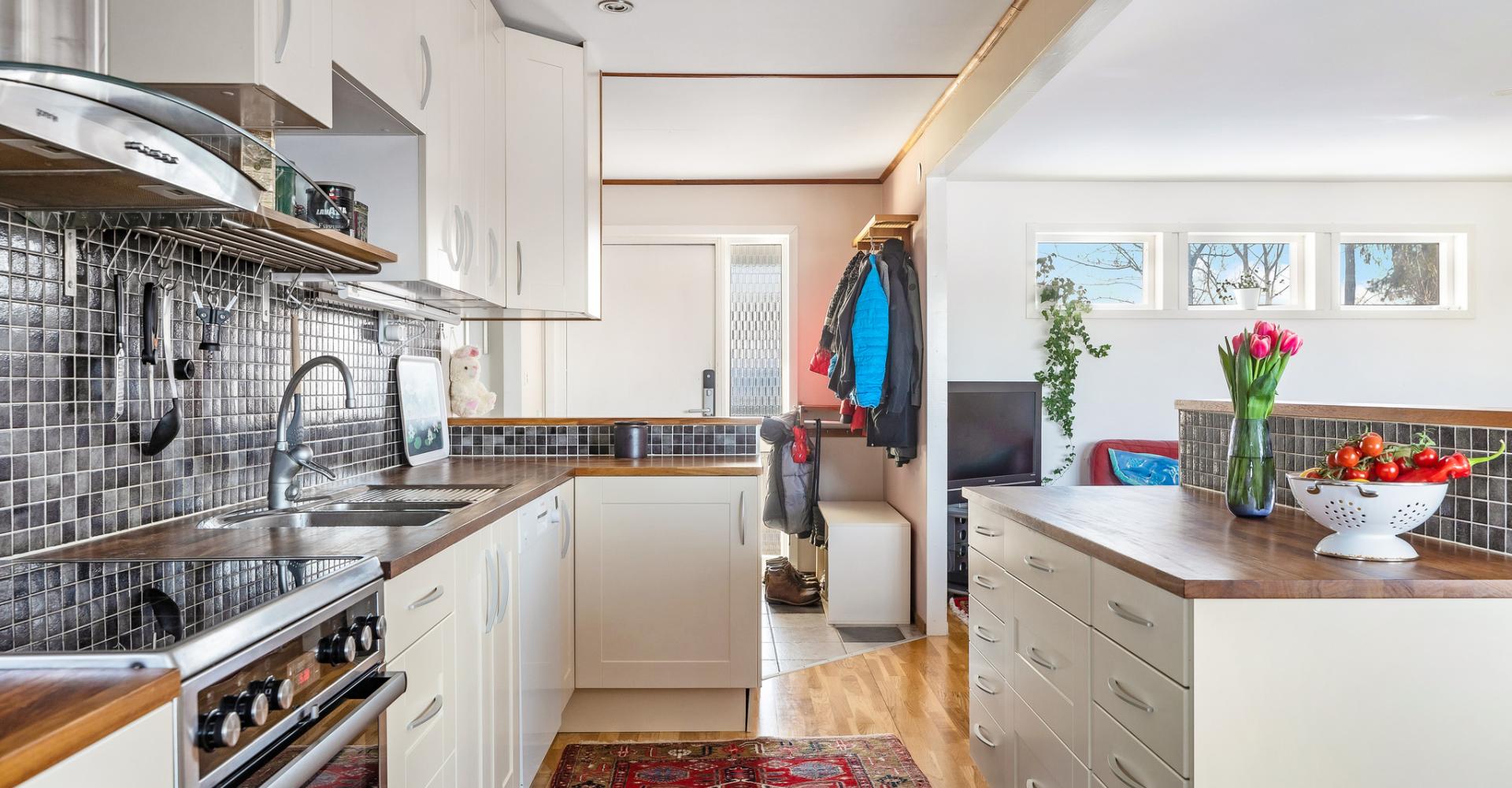 Kök från 2001 med parkettgolv samt infälld takbelysning. Vita profilerade skåpsluckor samt mörkare träbänkskiva (valnöt). Mosaik stänkskydd i grått/svart melerad färgton.